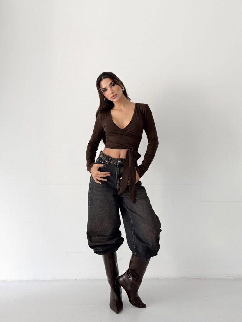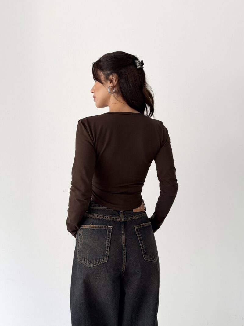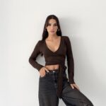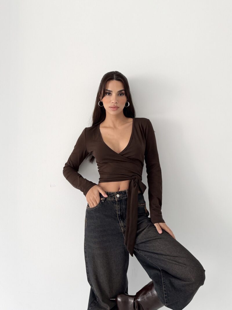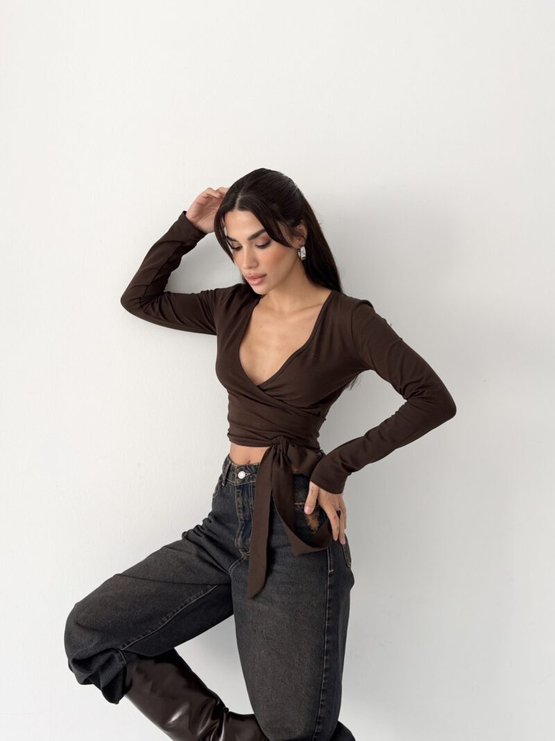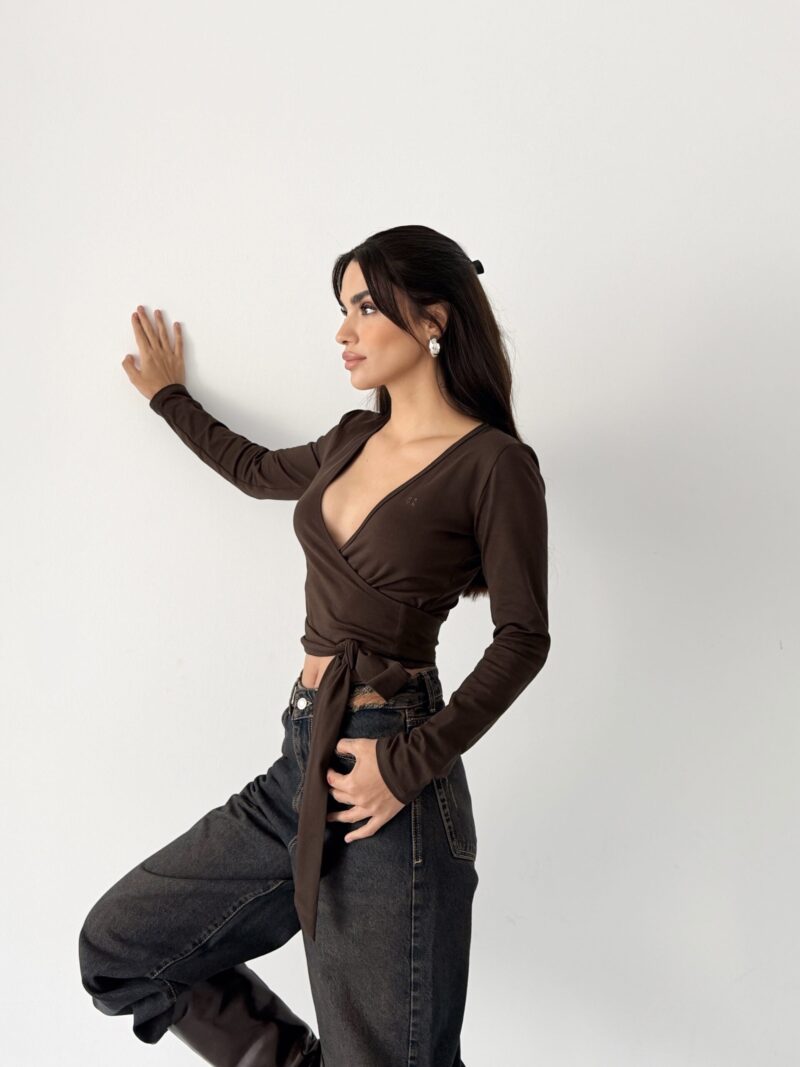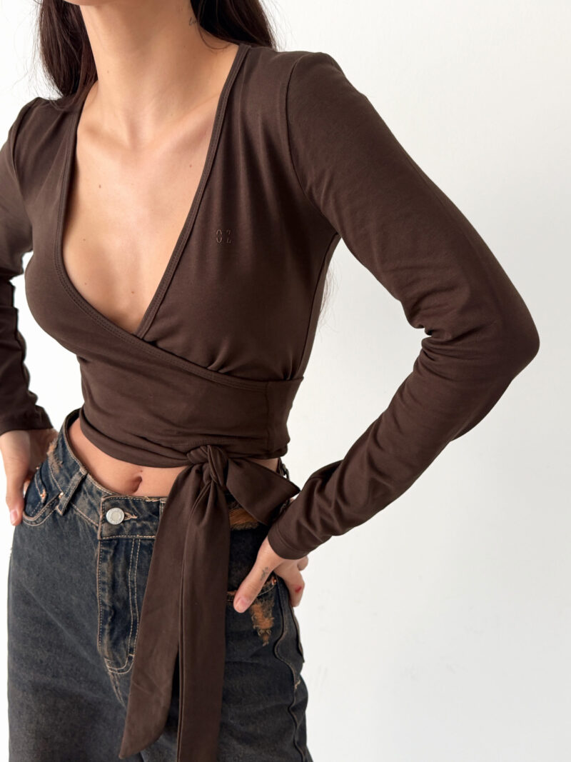 Çikolata kahvenin yumuşak ve doğal tonu, wrap kesimin feminen akışıyla birleşir. Organik pamuk içeriği sayesinde cilt dostu, nefes alan ve doğal bir his sunar. Esnek yapısı, bedeni kısıtlamadan serbest hareket hissi sağlar.